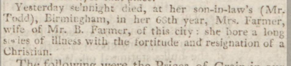 Mary died on 24th Sep 1811 at her daugher Elizabeth's house in Birmingham, Warwickshire, England. An obituary was published in The Hereford Journal on 2nd October 1811. There is a bit of a discrepancy with her age here, but its likely it is a misprint, or perhaps she was baptised later in her childhood than usual.