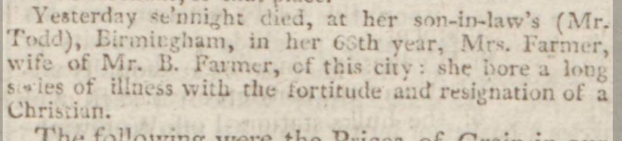 1. Elizabeth Farmer was born about 1772 in Hereford, Herefordshire, England. She married Thomas Todd on 29 Dec 1798 at All Saints Church in Hereford, Herefordshire, England. Elizabeth died