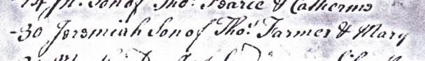 Jeremiah Farmer was born about 1753 in Ludlow, Shropshire, England as possibly the twelfth child of Thomas Farmer and Mary (further research is being carried out to determine exactly how many children Thomas and Mary had). Jeremiah was baptized on 30 May 1753 at St. Leonard's Church in Ludlow, Shropshire, England.